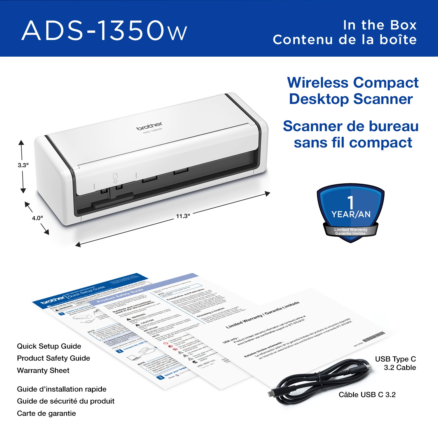 The Brother ADS-1350w Wireless Compact Desktop Scanner is here for all your scanning needs whether your work finds you at home, in the office, or on the go. Easy to set up, and featuring a compact footprint, lightweight design and wireless capability, this scanner is an ultra-handy asset to have at your disposal. For convenience and flexibility no matter where you are, use the Brother Mobile Connect App(1) and Wi-Fi connection to scan wherever you need – to your computer or favourite cloud service(2). It handles multiple document types, including photos, cards, and documents producing consistently sharp results, making it a great choice for small businesses, independent entrepreneurs, busy contractors and in environments like classrooms and small clinics. For quick scanning, feed pages into the 20-page automatic document feeder(3) that also handles double-sided pages in a single pass. And because it’s powered directly through a USB-C connection with your computer, you can rest assured it’s always ready to get to work for you. Added value includes a robust bundle(1) of 6 software applications that provides exceptional productivity. 1. Additional download required. Compatibility may vary by device and operating system. May require connection to a wireless network. 2. Internet connection and account with desired service required. 3. Maximum Capacity based on using 20 lb paper.