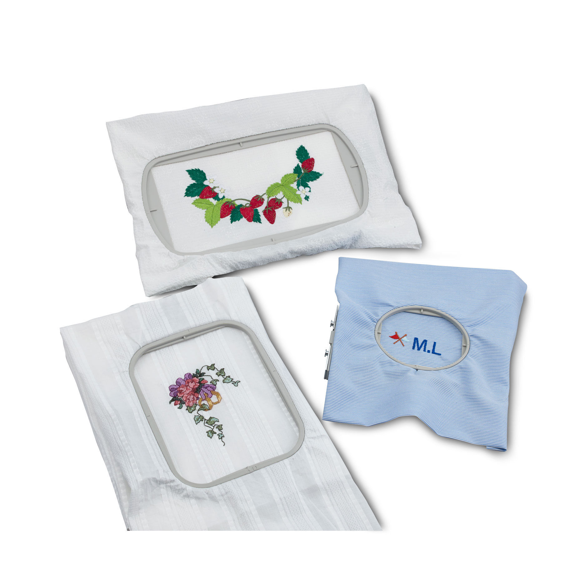 Create extra large designs without repositioning your fabric. Combine several small designs to create a larger design. No need to rehoop. Clear grid notched for accurate placement of embroidery designs. Markings on hoop for easy reference.