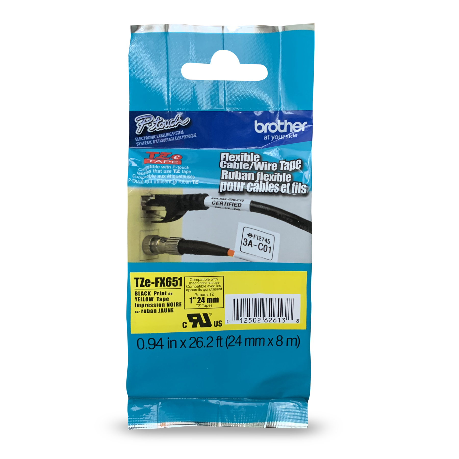Brother Genuine TZe-FX651 black on yellow 24 mm flexible ID laminated tape is designed for use with P-touch label makers and is perfect for many types of labelling applications. Featuring a specially formulated adhesive designed to stick to itself, it s great for wrapping around cylindrical surfaces such as cables, wires and PVC pipes making it a great choice for wire wrapping, flagging and more.
