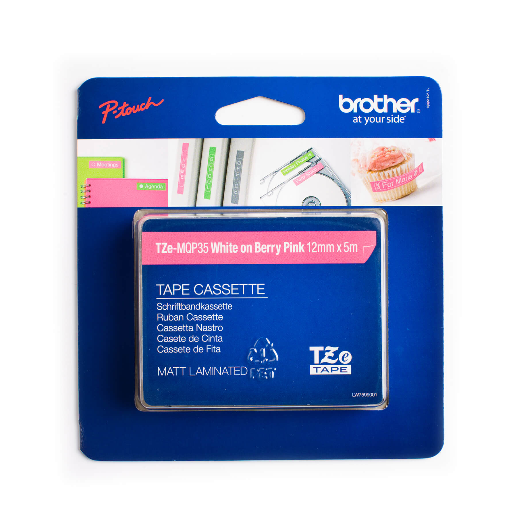 Brother Genuine TZe-MQP35 White Print on Berry Pink Tape is perfect for adding personal, decorative touches to gift-wrapping, party favours, home decor, scrapbooking, craft projects and more.